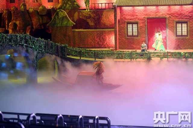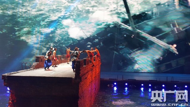 在神游華夏大劇院內(nèi),《閩南傳奇》正在上演,整場(chǎng)演藝共分六幕:天造鷺島、島城大戰(zhàn)、南洋歷險(xiǎn)、漁村人家、龍的傳人、福佑華夏,以閩南文化為主線,融入當(dāng)?shù)靥厣衙袼住⒚褡屣L(fēng)、民族音樂(lè)和人文歷史,用高科技的展示手法與國(guó)際最新的旅游演藝劇目結(jié)合起來(lái)。