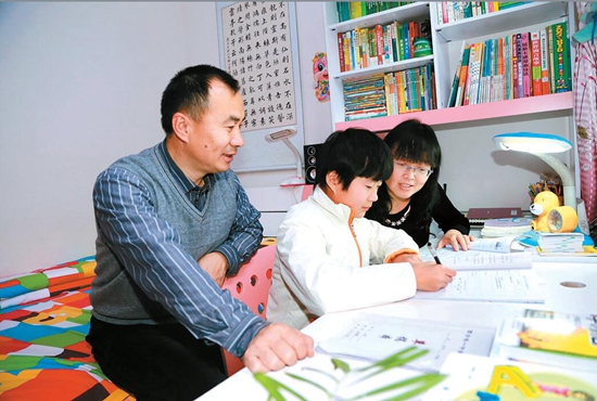 夫妻倆一起給女兒輔導功課 。