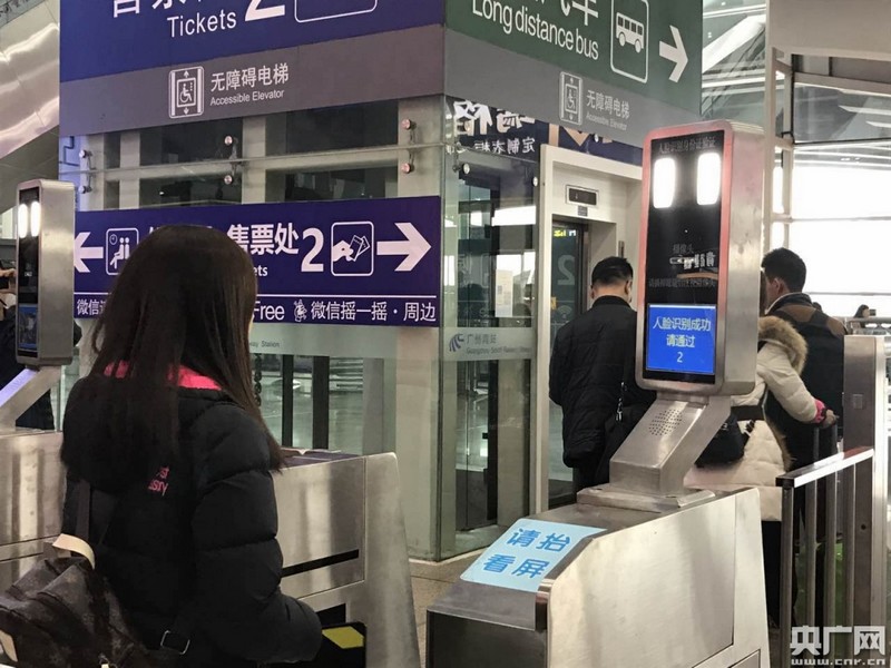 1月13日,春運(yùn)首日,廣州南站,旅客體驗(yàn)“刷臉”驗(yàn)票進(jìn)站,在工作人員引導(dǎo)下幾秒完成進(jìn)站 。