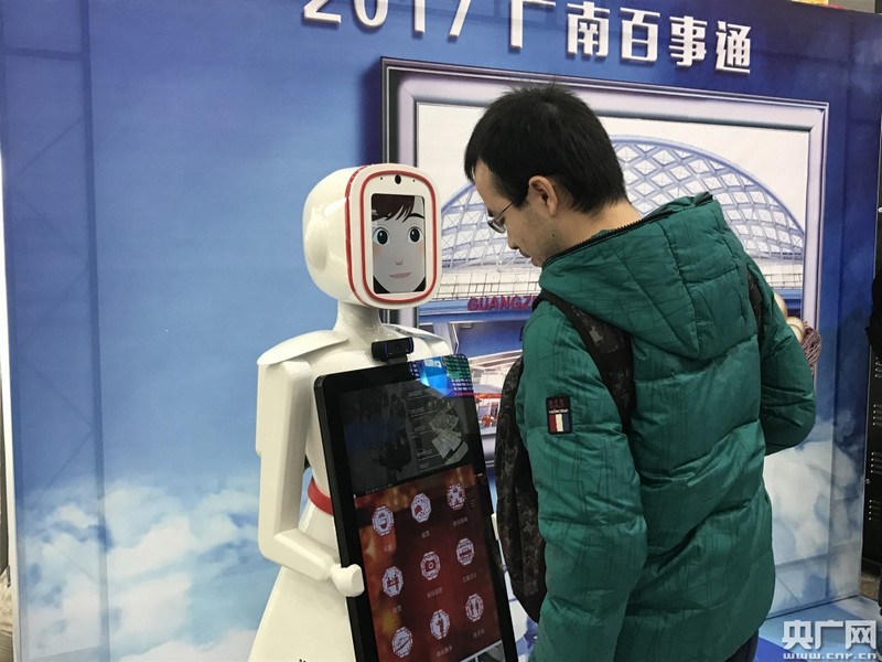 1月13日,春運(yùn)首日,廣州南站,旅客正在和智能機(jī)器人“小璐”對話,“小璐”是廣州南站最受歡迎的引導(dǎo)員。