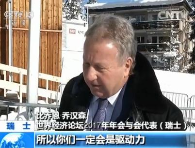 比喬恩·喬漢森 世界經濟論壇2017年年會與會代表(瑞士):整個世界都把目光投向中國,中國非常重要。中國很快就會成為世界上最大的經濟體,就像曾經多年是世界最大經濟體的美國,我相信在不遠的將來,你們就會是世界經濟最主要的驅動力,你們在非洲所做的,你們在拉丁美洲所做的,你們在那里的投資,包括在瑞士,中國同樣在收購瑞士的企業,所以你們一定會是驅動力。