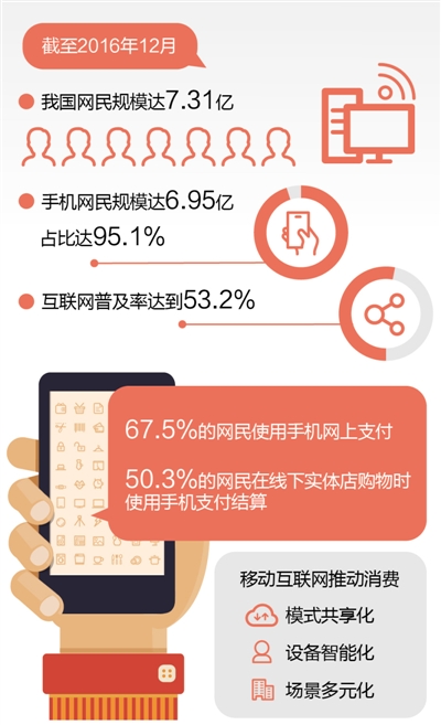 移動互聯網與線下經濟聯系日益緊密。《報告》顯示,2016年,我國手機網上支付用戶規模增長迅速,達到4.69億,年增長率為31.2%,網民手機網上支付的使用比例由57.7%提升至67.5%。手機支付向線下支付領域的快速滲透,極大豐富了支付場景,有50.3%的網民在線下實體店購物時使用手機支付結算。