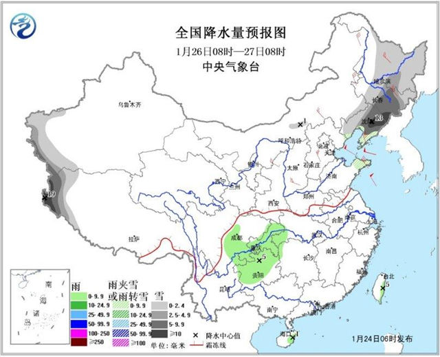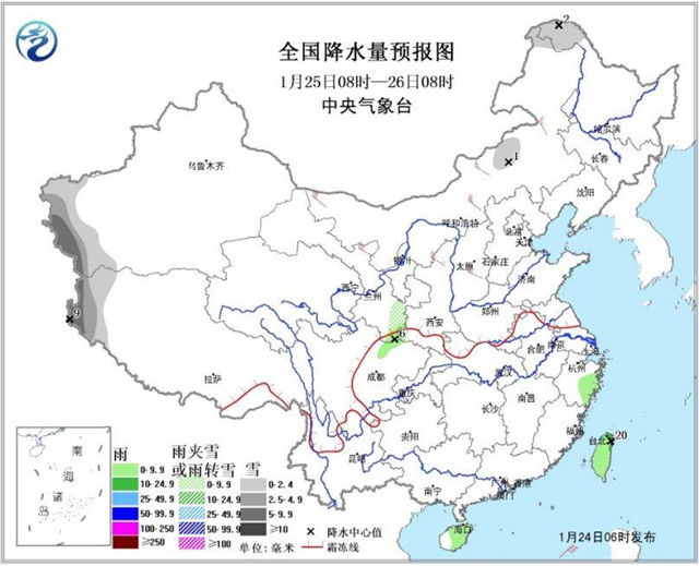 24日08時至25日08時,新疆北部與西南部的部分地區(qū)有小到中雪,局地大雪;陜西南部、四川盆地西南部和東北部、重慶中東部、湖北西部、貴州中西部、海南島、臺灣等地的部分地區(qū)有小雨或陣雨,局地中雨。臺灣海峽、南海東北部和中東部偏北海域有7~8級、陣風(fēng)9~10級的東北風(fēng)。