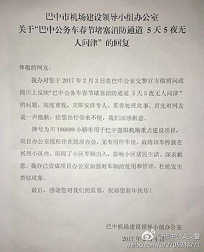 2月4日,巴中公安交警在“問政四川”平臺(tái)回復(fù)稱,巴中市機(jī)場(chǎng)建設(shè)領(lǐng)導(dǎo)小組辦公室對(duì)網(wǎng)友反映的“巴中公務(wù)車春節(jié)堵塞消防通道5天5夜無人問津”一事作出回應(yīng)。回復(fù)稱,經(jīng)調(diào)查發(fā)現(xiàn),該車用于巴中市恩陽機(jī)場(chǎng)重點(diǎn)建設(shè)項(xiàng)目,由于項(xiàng)目辦公室現(xiàn)租住在民房辦公,無專用停車位,故將車輛停放在興州小區(qū)內(nèi),阻礙了小區(qū)車輛出入,影響了小區(qū)居民生活。