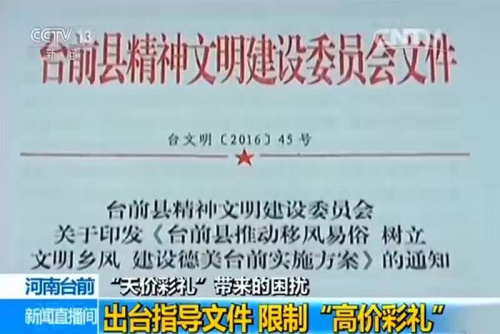 2016年年底,河南省臺前縣下發(fā)《臺前縣農村紅白事標準參照指導意見(征求意見稿)》等文件,對農村彩禮提出了參照標準,要求彩禮總數控制在6萬元以內。