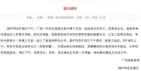 通報(bào)稱,2017年2月16日下午,廣饒一中學(xué)生商某在家中喝下農(nóng)藥,經(jīng)搶救無(wú)效死亡。悲劇發(fā)生后,縣教育局迅速組織人員展開調(diào)查,經(jīng)初步調(diào)查,商某曾因違反學(xué)校紀(jì)律受到留校察看處分,之后又因再次違紀(jì),學(xué)校與其家長(zhǎng)(其姨父代簽)簽訂了管理培養(yǎng)協(xié)議書。2017年2月13日下午課間,商某又違紀(jì);2月16日上午,學(xué)校對(duì)其做出退學(xué)處分(保留學(xué)籍),并通知家長(zhǎng)將其接回,其舅舅到校辦理完相關(guān)手續(xù)后,從學(xué)校將商某接走。16日下午,悲劇發(fā)生。目前,有關(guān)情況正在進(jìn)一步調(diào)查,相關(guān)善后事宜正在進(jìn)行中。
