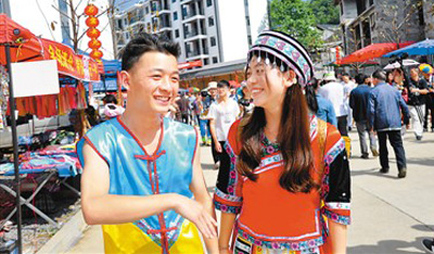 2016年8月14日,在湖北省恩施市紅土鄉石窯集鎮上,土家族男女青年正在趕場相親。