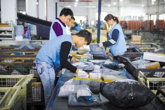 工作人員分配電子商務(wù)快遞包裹。(圖片來(lái)自網(wǎng)絡(luò))