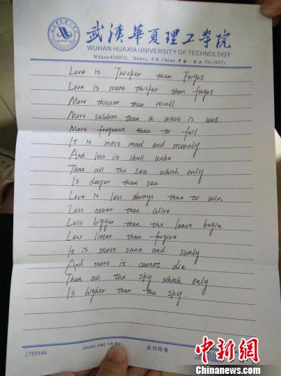 該男生名叫周鶴齡,為了寫好這34份書信,他上網查找大量資料,還在圖書館翻閱書籍,花了3天時間完工。他說:“我在參考英文詩歌的基礎上再原創,盡量嘗試用不同的方式去表達,希望每一封信都能準確地傳達出我的想法”。每封信件用信封裝著,英文字體清秀,字里行間流露出周鶴齡對女同學們的祝愿、祝福。