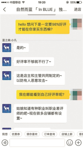 一家名為“自然而藍(lán)”的店鋪主營服裝類商品,北青報(bào)記者以顧客身份進(jìn)行詢問,客服稱,買家發(fā)出的好評率要在98%以上,才可以在店中購買!昂迷u率不夠就不行了,這也是店主和主管共同制定的,以防有人惡意攻擊!笨头藛T稱,目前有很多家店鋪都有類似設(shè)置,“因?yàn)橛蟹N行當(dāng)叫職業(yè)差評師,所以很多家店鋪都會設(shè)置,只是標(biāo)準(zhǔn)不一樣,算是不成文的規(guī)矩。”