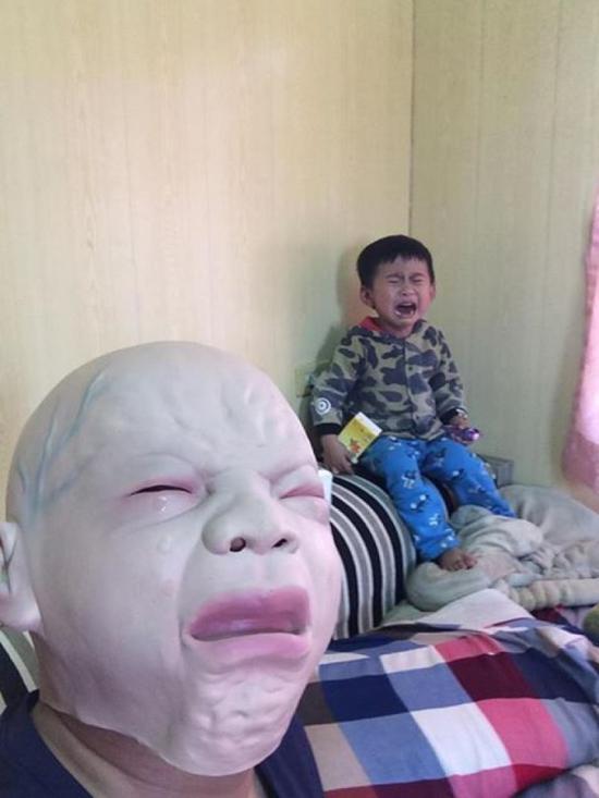 曾姓父親在facebook專頁“爆廢公社”上傳照片,他戴著的面具表情猙獰,光禿的頭頂還爆現青筋,看上去令人毛骨悚然,難怪把兒子嚇哭。這位爸爸還狡辯說兒子根本不怕,哭鬧只因為要午睡,他不給喝飲料和吃糖果。