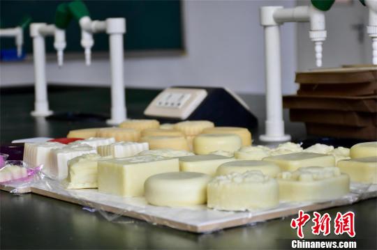 該校化學工程與工藝專業大二學生王宇介紹,制作手工皂第一步是用氫氧化鈉和純凈水配制堿水,然后再把椰子油、棕櫚油等植物油與干花混合加熱,最后把堿水和加熱到50攝氏度左右的精油混合攪拌,形成如沙拉狀的粘稠液體倒入磨具。