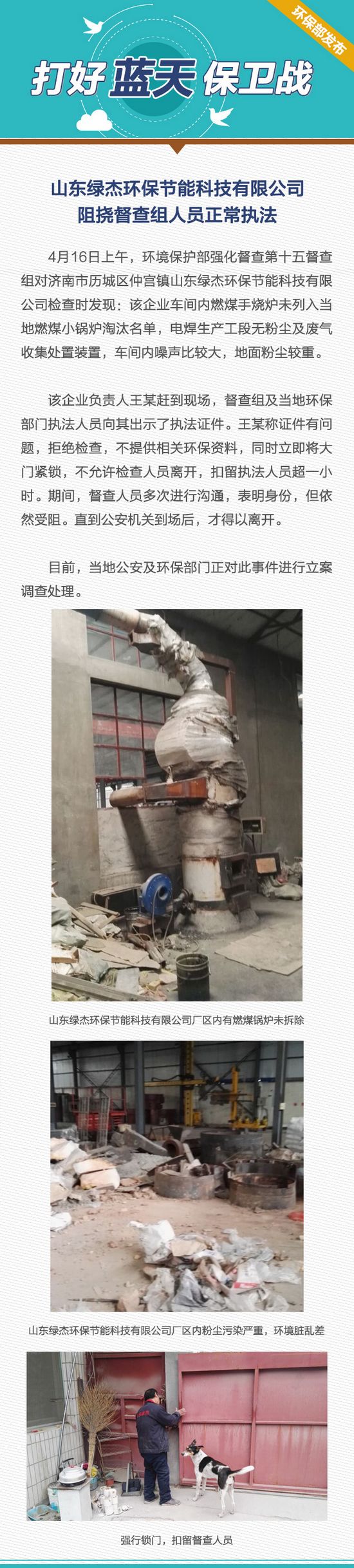 中國(guó)網(wǎng)4月16日訊 據(jù)環(huán)境保護(hù)部宣傳教育司官方微博消息,4月16日上午,環(huán)境保護(hù)部強(qiáng)化督查山東省濟(jì)南市督查組在對(duì)山東綠杰環(huán)保節(jié)能科技有限公司正常檢查執(zhí)法時(shí)受阻,并被非法扣留。目前當(dāng)?shù)毓布碍h(huán)保部門正對(duì)此事進(jìn)行立案調(diào)查處理。
