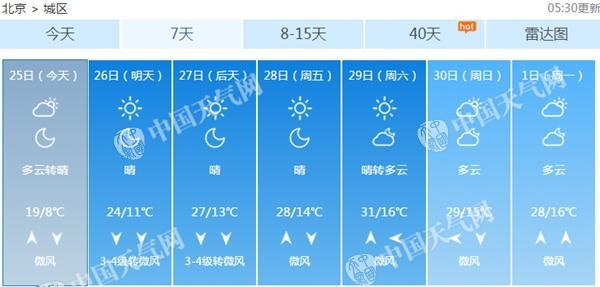 中國天氣網訊 今天(25日)白天北京多云轉晴,云量增多,最高氣溫僅有19℃,為近期氣溫最低的一天,提醒民眾注意及時調整著裝。