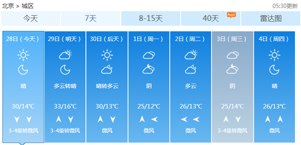 今天,北京依然晴天為主,氣溫繼續走高。北京市氣象臺6時發布天氣預報:今天白天晴間多云,北風一二級轉三四級,最高氣溫30℃;夜間晴,北風二級左右,最低氣溫15℃。