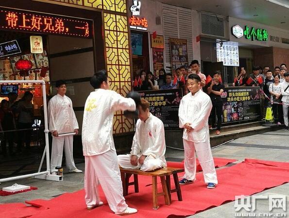 央廣網深圳4月29日消息(記者 于揚)在深圳真有鐵頭功!而且這位高手就藏在深圳的東門,他可以倒立在一根堅硬的鐵釘上數(shù)十分鐘,他就是鄭衛(wèi)勇。在之前香港舉行的“感恩杯”第十屆香港國際武術大賽上,他表演頭頂鐵釘?shù)沽ⅲA計表演80分鐘,但第40分鐘時,裁判員已經激動地宣布他獲得了冠軍!記者近日也用鏡頭紀錄了他令人咋舌的“功力”——倒立在一根堅硬的鐵釘上,頭部把釘在木板上的鐵釘壓彎!