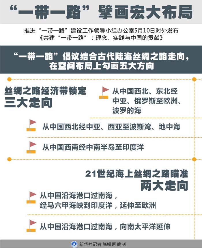 循著絲路上的聲聲駝鈴與碧海中的帆檣舟楫,“一帶一路”倡議結合古代陸海絲綢之路走向,在空間布局上勾畫五大方向。