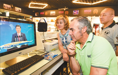 浙江義烏的西班牙客商正在收看“一帶一路”國際合作高峰論壇開幕式。