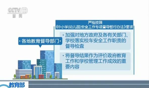 同時,各地教育督導部門要嚴格按照《中小學(幼兒園)安全工作專項督導暫行辦法》的要求,加強對地方政府及各有關部門、學校落實校車安全工作職責的督導檢查。將督導結果作為評價政府教育工作和學校管理工作成效的重要內容。