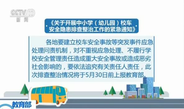 《通知》還明確,各地要建立校車安全事故等突發事件應急處理問責機制,對不重視應急處理、不履行學校安全管理責任造成重大安全事故或造成惡劣社會影響的,要依法追究有關責任人責任,并將排查整治情況于5月30日前上報教育部。