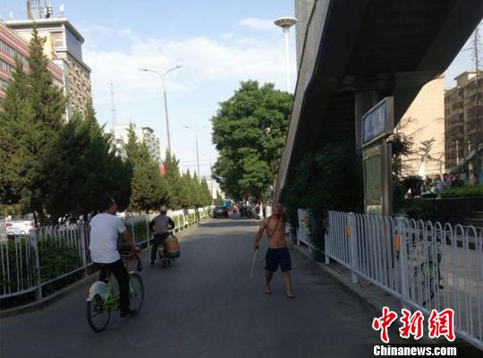 6月5日,記者從蘭州交警部門了解到,一男子酒后無照駕駛摩托車闖紅燈,不但不配合民警執法,反而持鐵棍暴力襲警。圖為男子持鐵棍行兇。 交警部門提供 攝