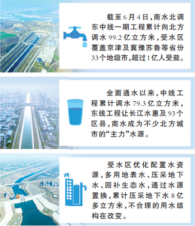 保生態,不合理用水結構在變。南水來了,多用地表水、壓采地下水、回補生態水,受水區優化配置水資源,通過水源置換,累計壓采地下水8億多立方米。北京“喝存補”并舉,河湖水質明顯改善;天津用南水置換出生態用水,變應急補水為常態補水,海河水生態有了保障;山東向東平湖、南四湖生態調水2億立方米,干渴的湖泊重現生機。