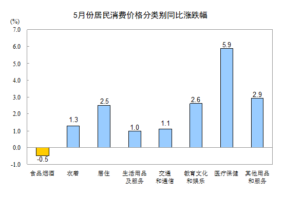 5月份,其他七大類價格同比均有所上漲。其中,醫(yī)療保健價格上漲5.9%,其他用品和服務價格上漲2.9%,教育文化和娛樂價格上漲2.6%,居住價格上漲2.5%,衣著、交通和通信、生活用品及服務價格分別上漲1.3%、1.1%和1.0%。