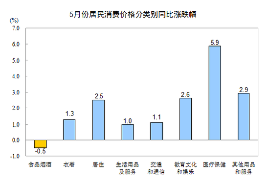 5月份,其他七大類價格同比均有所上漲。其中,醫療保健價格上漲5.9%,其他用品和服務價格上漲2.9%,教育文化和娛樂價格上漲2.6%,居住價格上漲2.5%,衣著、交通和通信、生活用品及服務價格分別上漲1.3%、1.1%和1.0%。