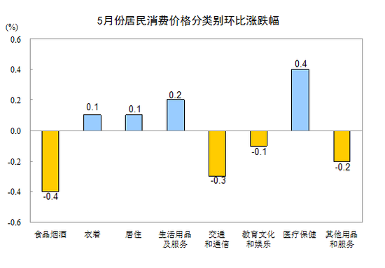 5月份,全國居民消費價格總水平環比下降0.1%。其中,城市下降0.1%,農村下降0.1%;食品價格下降0.7%,非食品價格持平;消費品價格下降0.2%,服務價格上漲0.1%。