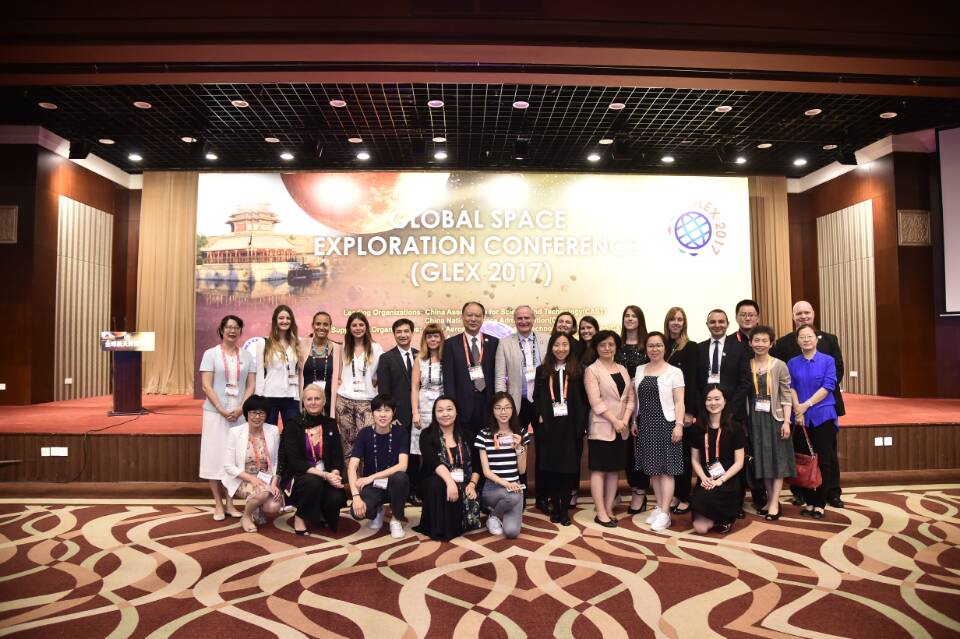 備受關注的2017年全球航天探索大會8日在京落下帷幕,與會代表們在主會場合影留念。