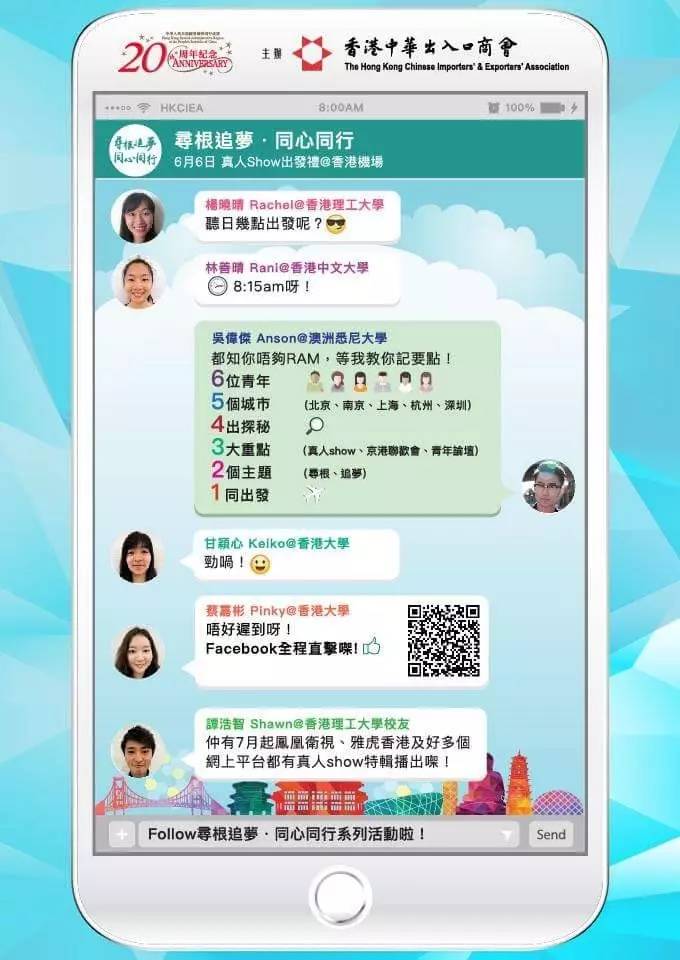 據(jù)悉,該活動為中出慶回歸廿周年系列活動的重點項目,籌備歷時半年,以真人騷形式進行,特別安排專業(yè)攝製團隊跟拍活動全程,邀請了6位不同背景的香港青年圍繞“尋根”、“追夢”的主題,游歷北京、南京、上海、杭州及深圳五個城市,廣泛接觸在內(nèi)地工作、創(chuàng)業(yè)、學習的香港青年,用香港青年的眼光看中華民族的歷史與民間風俗,了解內(nèi)地的經(jīng)濟發(fā)展和今昔變遷。
