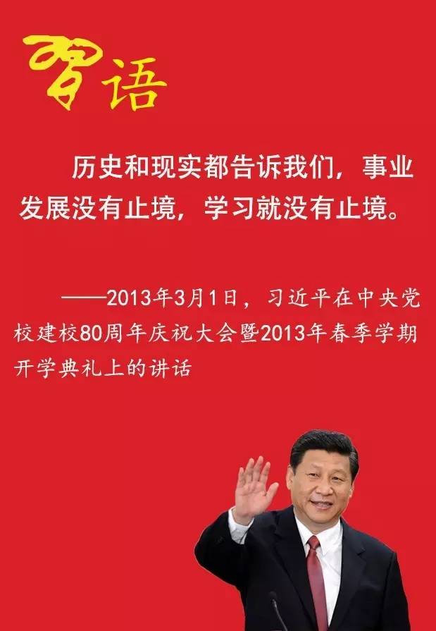 習近平指出,要堅持干什么學什么、缺什么補什么,努力使自己真正成為行家里手、內行領導。他說:“學史可以看成敗、鑒得失、知興替;學詩可以情飛揚、志高昂、人靈秀;學倫理可以知廉恥、懂榮辱、辨是非。”