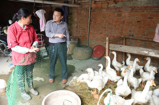 這是安徽省霍邱縣長集鎮七里棚村第一書記羅煒(右)正在查看村民謝文會家的養鴨情況(5月23日攝)。新華社記者 郭晨 攝