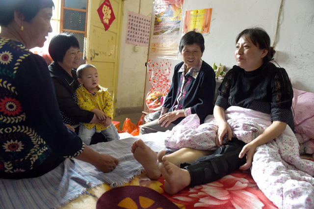 這是安徽省黃山市新譚鎮上資村的村民們前來看望前不久從電動車上不慎摔下的該村第一書記黃艷艷(右一)(5月26日攝)。新華社記者 郭晨 攝