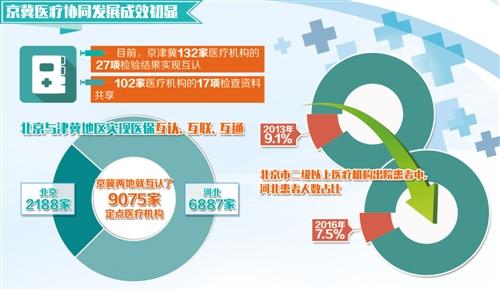 “目前,京津冀132家醫療機構27項檢驗結果實現互認,102家醫療機構有17項檢查資料共享。北京與津冀地區實現醫保互認、互聯、互通,僅京冀兩地就互認了9075家定點醫療機構,其中北京2188家,河北6887家。2016年北京市二級以上醫療機構出院患者中,河北患者人數占比從2013年的9.1%下降到7.5%,京冀醫療協同發展成效初顯!北本┦行l計委委員、新聞發言人高小俊介紹。