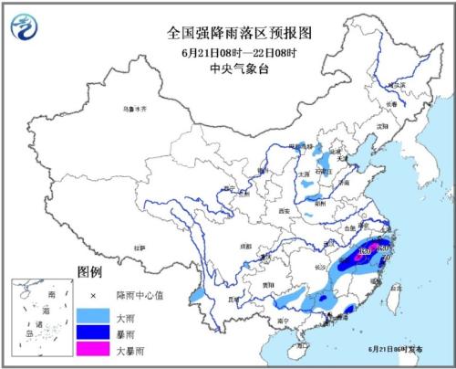 全國強降雨落區預報圖(6月21日08時-22日08時)