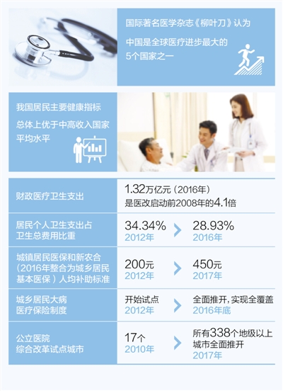 5年來,我國健康水平持續改善,居民主要健康指標總體上優于中高收入國家平均水平,人均期望壽命從2010年的74.83歲上升至2016年的76.34歲。較高的健康績效,為全面建成小康社會奠定了重要基礎。世界銀行、世界衛生組織認為,中國在實現全民健康覆蓋方面迅速邁進,改革成就舉世矚目。