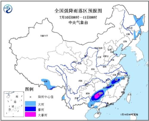 全國強降雨落區(qū)預報圖(7月10日08時-11日08時)