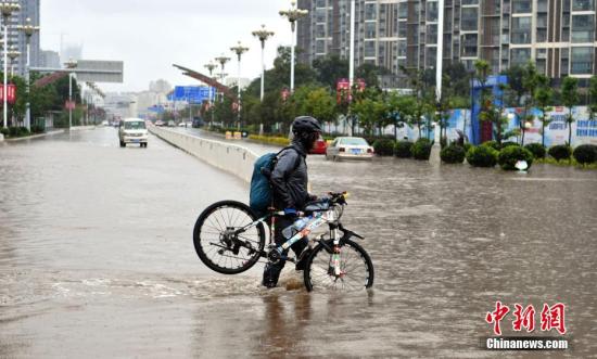 7月22日,民眾抬著自行車從積水路上走過。當日,昆明持續降雨,城區多處路段積水。昆明市氣象臺發布暴雨藍色預警,未來12小時昆明市區及周邊多地區將持續降雨。 中新社記者 任東 攝