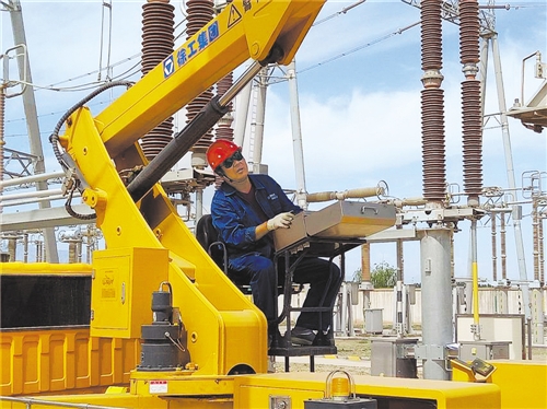 進入7月,甘肅電網進入迎峰度夏關鍵期,電力員工冒酷暑、戰高溫,全力確保電網安全穩定運行。圖為國網甘肅檢修公司高空作業車司機正在運送高空作業人員到達工作位置,對設備開展檢查。本報記者 李琛奇 通訊員 王曉莉攝影報道
