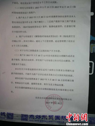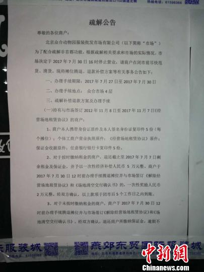 北京“動(dòng)批”眾合市場26日貼出正式疏解公告。圖為疏解公告。公告中稱,市場于2017年7月30日16時(shí)停止?fàn)I業(yè)!≡ 攝