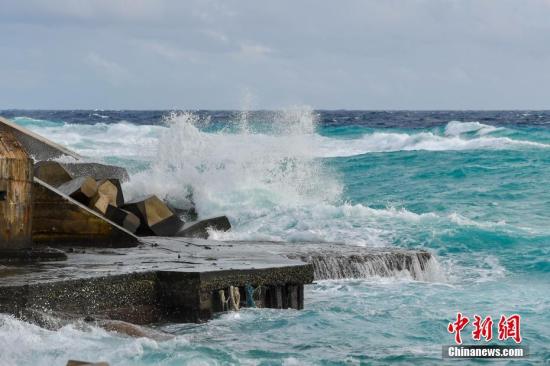 資料圖:受臺風(fēng)?ㄓ绊,23日西沙、中沙群島附近海面,西到西南風(fēng)7-8級,陣風(fēng)9級,三沙永興島附近海面掀起層層巨浪,拍打岸邊。 中新社記者 駱云飛 攝