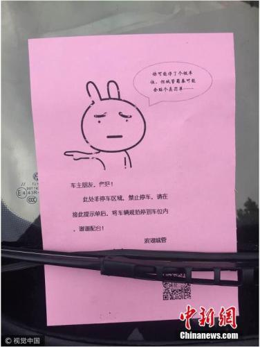“春風(fēng)十里不如你,論停車(chē),我只服你”、“你可能停了個(gè)假車(chē),但城管蜀黍可能會(huì)貼個(gè)真罰單”……網(wǎng)絡(luò)卡通形象兔斯基配上調(diào)皮的語(yǔ)言,這樣的停車(chē)提示單讓人忍俊不禁。