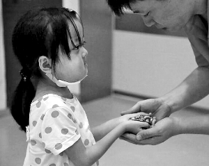 7歲的河南登封女孩王越患有一種非常罕見的病—石骨癥,隨時可能猝死。妹妹剛剛1歲半,也被查出患同樣的病。父親王向東已在骨髓庫找到全相合供者,待供者檢查身體合格,將會為兩個孩子做骨髓移植。但一個孩子治療費用至少50萬元。已花光了家里全部積蓄的王向東,這次來北京,借遍親朋好友才借了不到20萬元,實在無力承擔兩個孩子的移植費用。聽到爸爸悄悄跟媽媽說借的錢遠遠不夠,王越從包里拿出存錢罐,遞給爸爸,“給妹妹治病吧,我大了,不治也沒關系的,這是我攢下的錢,都拿去吧!保ù蠛訄螅