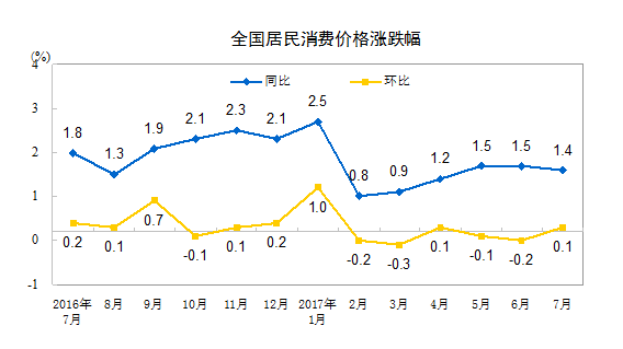2017年7月份,全國居民消費價格同比上漲1.4%。其中,城市上漲1.5%,農村上漲1.0%;食品價格下降1.1%,非食品價格上漲2.0%;消費品價格上漲0.5%,服務價格上漲2.9%。1-7月平均,全國居民消費價格總水平比去年同期上漲1.4%。