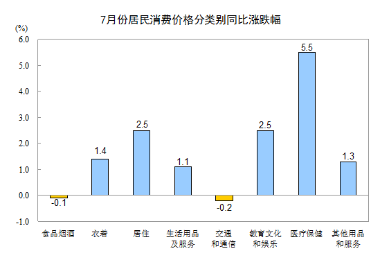 7月份,其他七大類價格同比六漲一降。其中,醫療保健價格上漲5.5%,居住、教育文化和娛樂價格均上漲2.5%,衣著、其他用品和服務、生活用品及服務價格分別上漲1.4%、1.3%和1.1%;交通和通信價格下降0.2%。