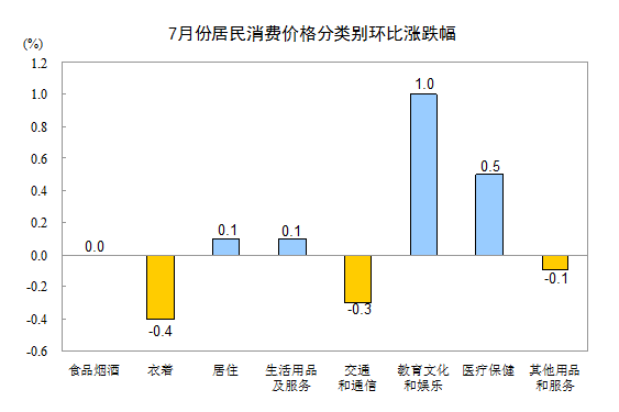 7月份,全國居民消費價格環比上漲0.1%。其中,城市上漲0.1%,農村持平;食品價格下降0.1%,非食品價格上漲0.2%;消費品價格下降0.2%,服務價格上漲0.6%。