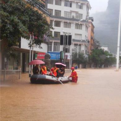 目前當(dāng)?shù)剡在持續(xù)降雨中。7條街道被水浸泡。當(dāng)?shù)卣M織交警上街疏導(dǎo)交通,消防、武警出動(dòng)橡皮艇轉(zhuǎn)移群眾。沿街商鋪的店主在收到水情通報(bào)后,在昨天已經(jīng)開始有序轉(zhuǎn)移物資。