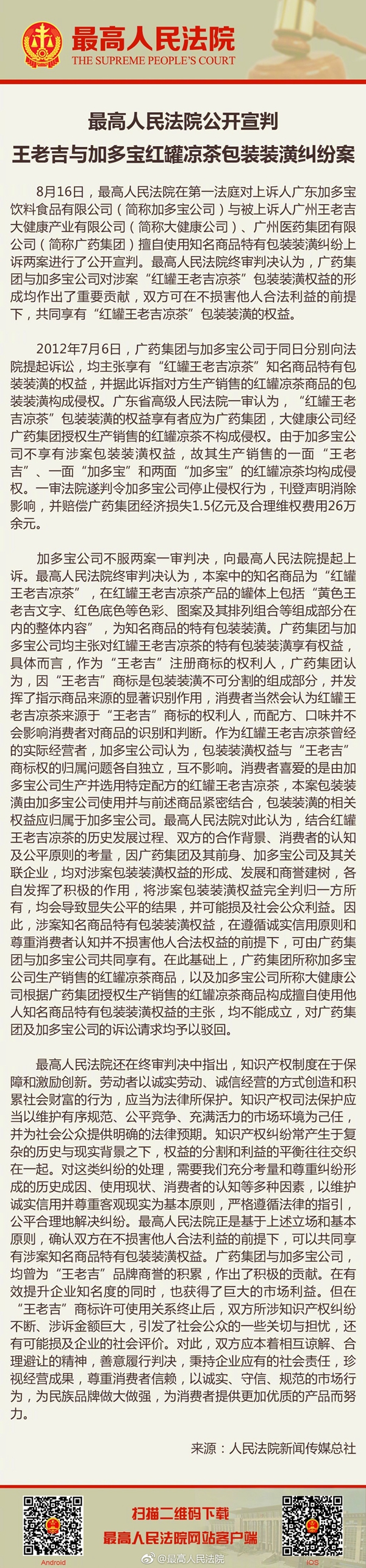 最高人民法院今天在第一法庭對(duì)上訴人廣東加多寶飲料食品有限公司(簡(jiǎn)稱加多寶公司)與被上訴人廣州王老吉大健康產(chǎn)業(yè)有限公司(簡(jiǎn)稱大健康公司)、廣州醫(yī)藥集團(tuán)有限公司(簡(jiǎn)稱廣藥集團(tuán))擅自使用知名商品特有包裝裝潢糾紛上訴兩案進(jìn)行了公開(kāi)宣判。最高人民法院終審判決認(rèn)為,廣藥集團(tuán)與加多寶公司對(duì)涉案“紅罐王老吉涼茶”包裝裝潢權(quán)益的形成均作出了重要貢獻(xiàn),雙方可在不損害他人合法利益的前提下,共同享有“紅罐王老吉涼茶”包裝裝潢的權(quán)益。(新民晚報(bào) 潘子璇)