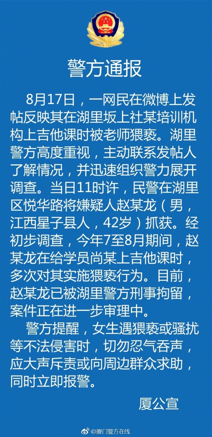 通報顯示,8月17日,一網(wǎng)民在微博上發(fā)帖反映其在湖里坂上社某培訓(xùn)機(jī)構(gòu)上吉他課時被老師猥褻。廈門湖里警方高度重視,主動聯(lián)系發(fā)帖人了解情況,并迅速組織警力展開調(diào)查。